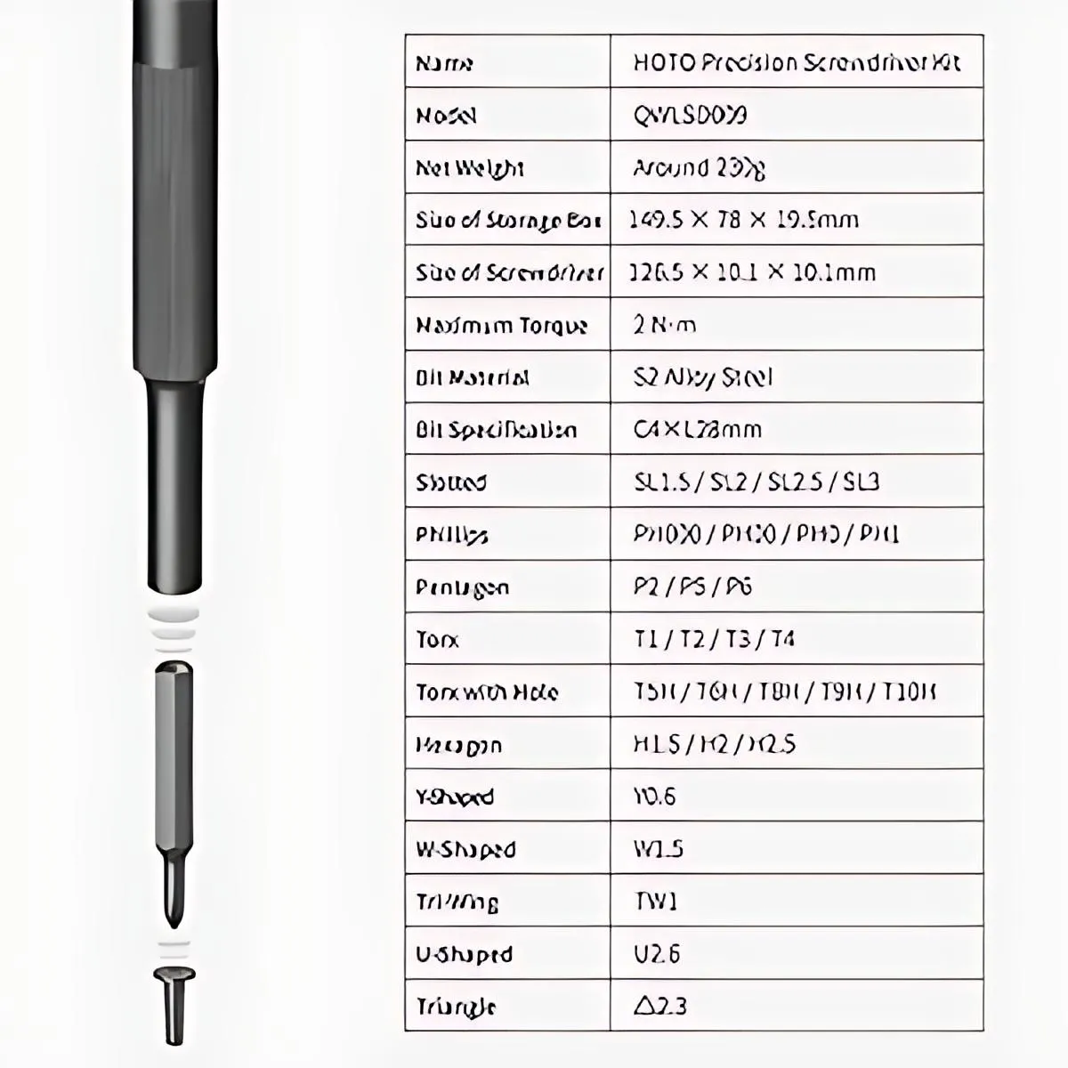 - ขนาดหัวไขควงที่มีในชุด: หัวแบน: SL1.5 / SL2.0 / SL2.5 / SL3.0, ฟิลลิปส์: PH000 / PH00 / PH0 / PH1, ห้าเหลี่ยม: P2 / P5 / P6, ทอร์กซ์: T1 / T2 / T3 / T4, ทอร์กซ์มีรู: T5H / T6H / T8H / T9H / T10H, หกเหลี่ยม: H1.5 / H2.0 / H2.5, หัวตัว Y: Y0.6, หัวตัว W: W1.5, Tri-Wing: TW1, หัวตัว U: U2.6, สามเหลี่ยม: Δ2.3